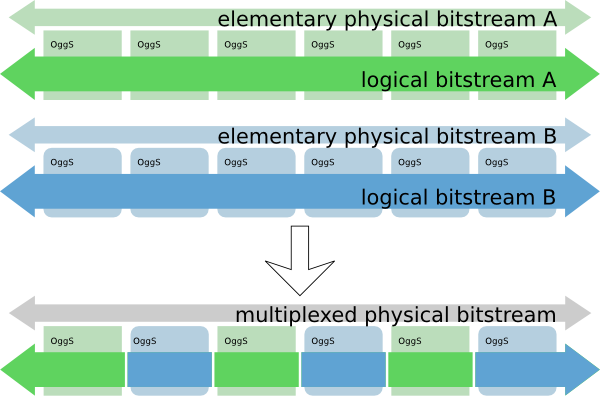 Multiple logical/elementary bitstreams can be combined into a single multiplexed bitstream by interleaving whole pages from each contributing elementary stream in time order. The result is a single physical stream that multiplexes and frames multiple logical streams. Each logical stream is identified by the unique stream serial number stamped in its pages. A physical stream may include a 'meta-header' (such as the Ogg Skeleton) comprising its own Ogg page at the beginning of the physical stream. A decoder recovers the original logical/elementary bitstreams out of the physical bitstream by taking the pages in order from the physical bitstream and redirecting them into the appropriate logical decoding entity.